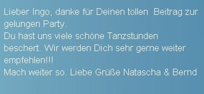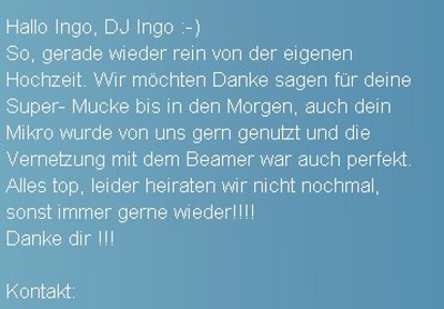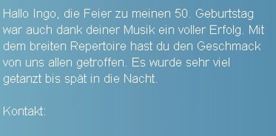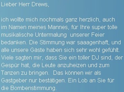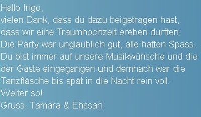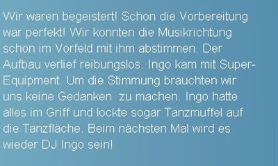 Außer sehr vielen, zufriedenen Brautpaaren und Geburtstagskinder, Silvestergäste, Ü30 Tänzer und jecke Karnevallisten, habe ich natürlich auch Firmenkunden gehabt, wie zum Beispiel das Eduardus Krankenhaus, den Berufsverband der deutschen Markforschung, die Stadt Köln, Anwaltskanzleien, Gesellschaft für Anlagen- und Reaktorsicherheit, Halloween auf der Burg Satzvey, Karneval im 12 Apostel und.....