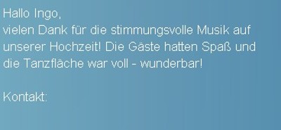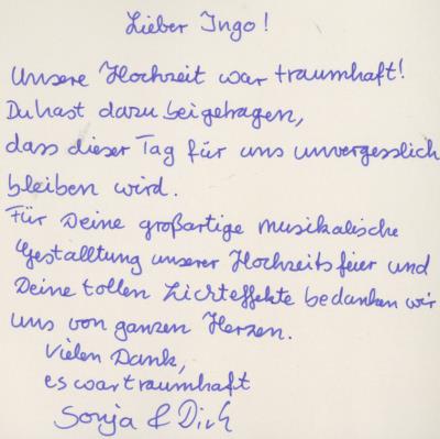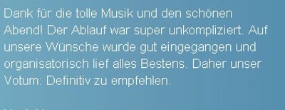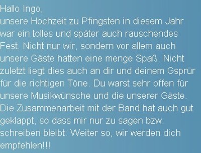 Außer sehr vielen, zufriedenen Brautpaaren und Geburtstagskinder, Silvestergäste, Ü30 Tänzer und jecke Karnevallisten, habe ich natürlich auch Firmenkunden gehabt, wie zum Beispiel das Eduardus Krankenhaus, den Berufsverband der deutschen Markforschung, die Stadt Köln, Anwaltskanzleien, Gesellschaft für Anlagen- und Reaktorsicherheit, Halloween auf der Burg Satzvey, Karneval im 12 Apostel und.....